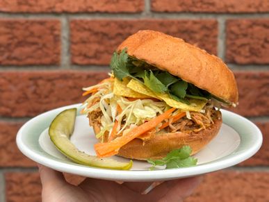 Seasoned pork sausage patty, pickled daikon, carrots, herbs (cilantro, mint), greens, challah bun